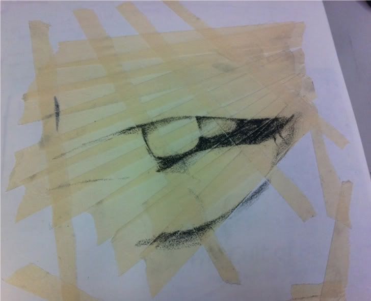 In these experiments I used a super soft graphite stick on the masking tape. This produced a very textured effect, with the cracks and grooves in the masking tape being emphasised under the graphite.